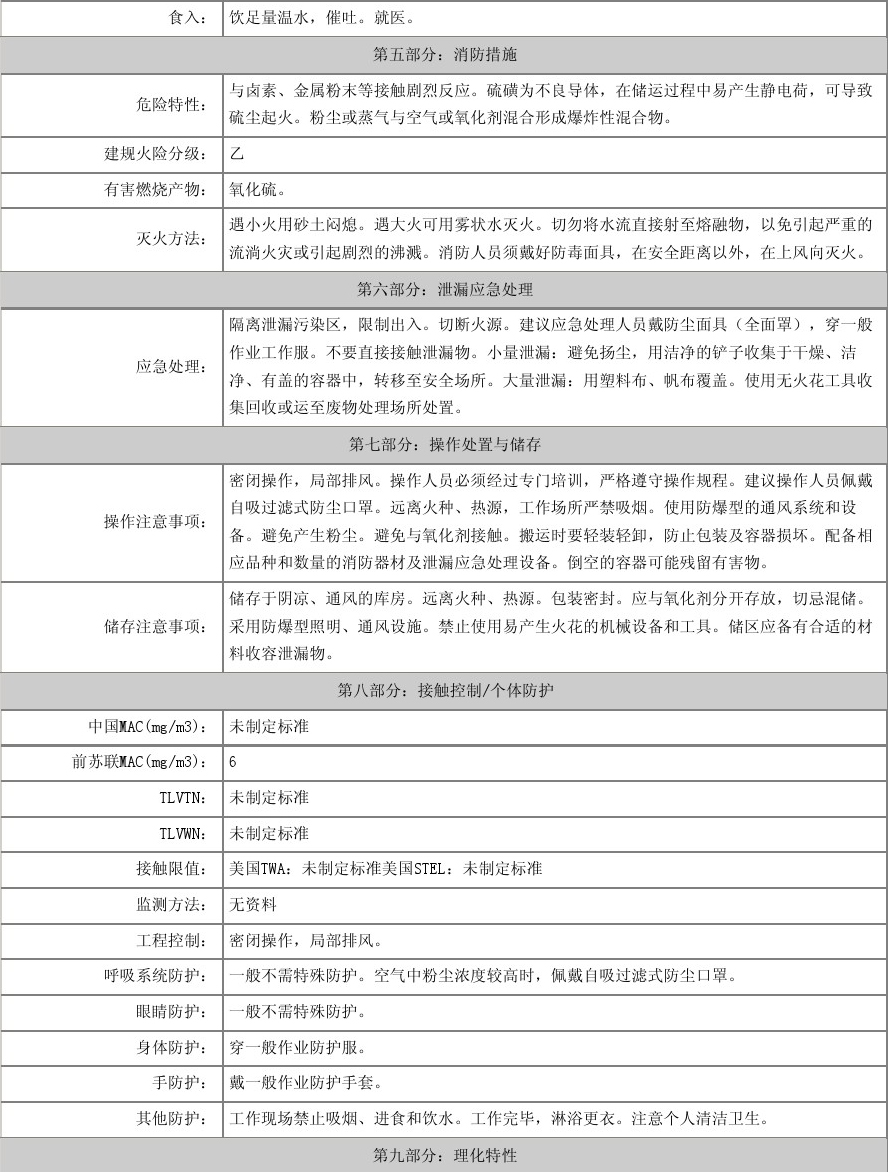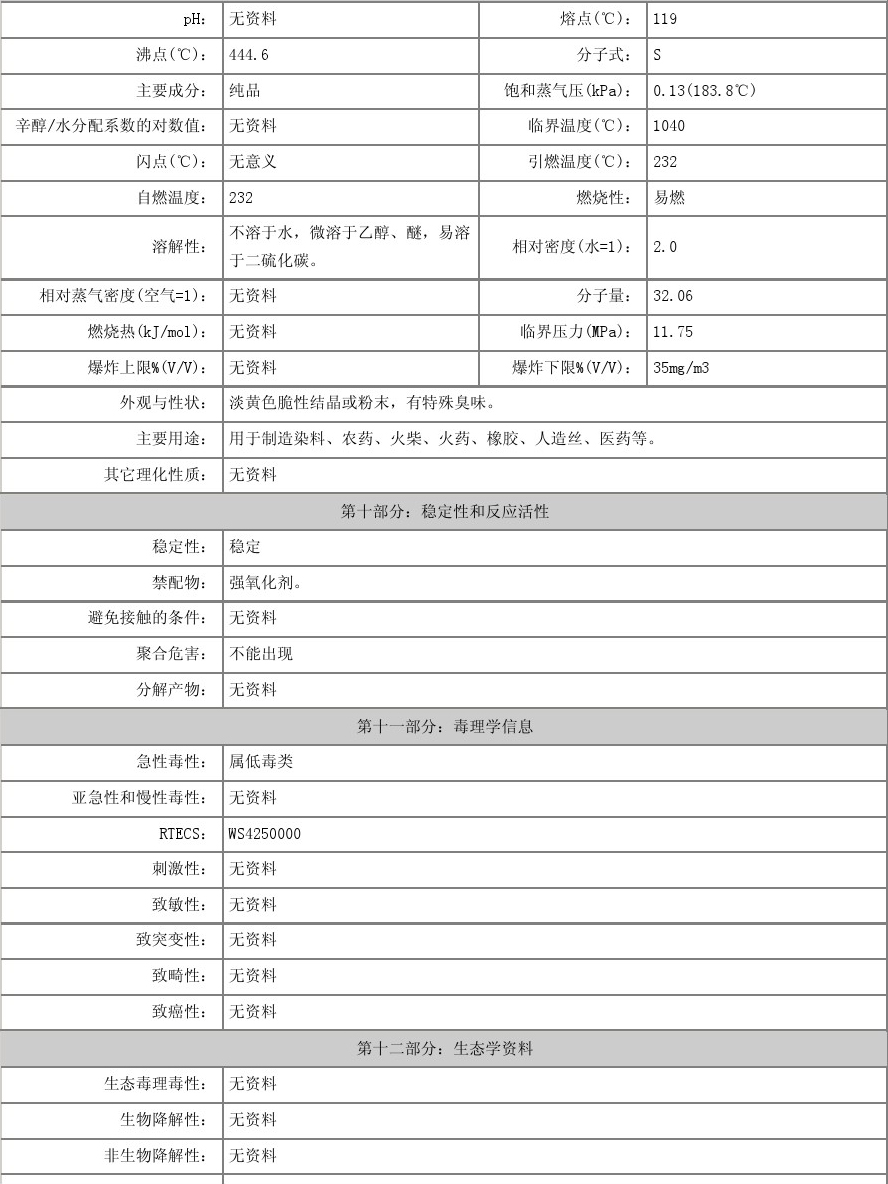 物化性質(zhì):性狀 粉狀硫黃為淡黃色粉末。熔點(diǎn)112.8℃沸點(diǎn)444.6℃相對密度2.07溶解性 易溶于二硫化碳,不溶于水,略溶于乙醇和醚類。